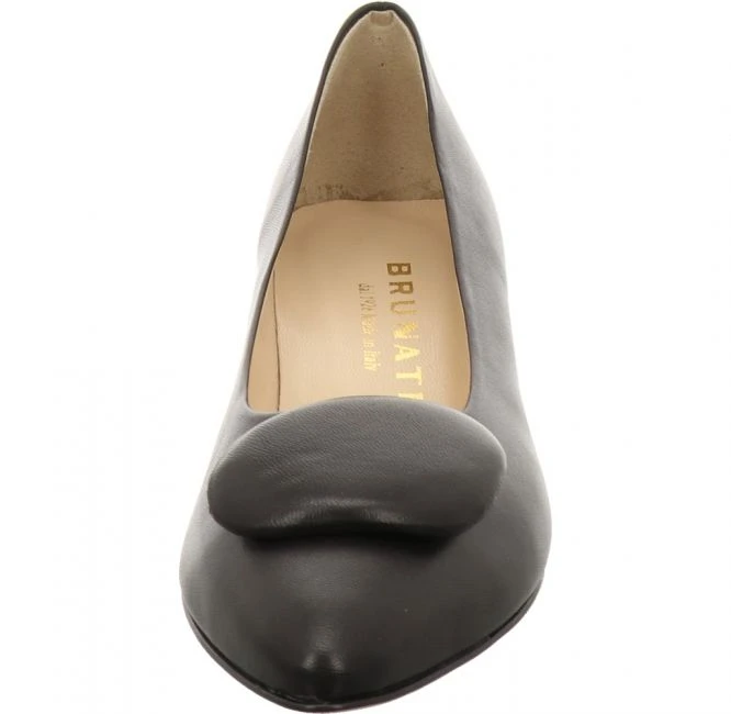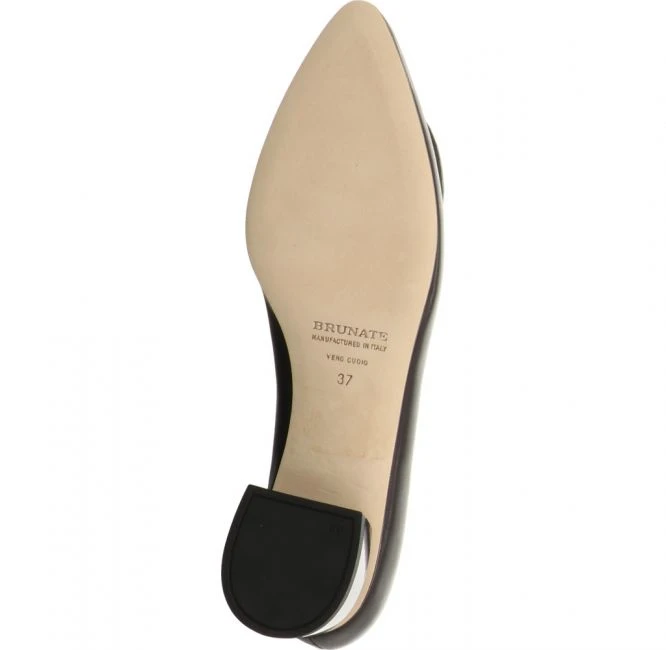 Eleganter Pumps der italienischen Traditionsmarkte Brunate. Obermaterial und Innenfutter bestehen aus hochwertigem weichem Leder. Besonders hübsch ist das schlichte und doch edle Schmuckelement und der glänzende kleine Blockabsatz. Für die Laufsohle wurde hochwertiges Leder verwendet. Ein klassisch bequemer Schuh für jeden Tag!