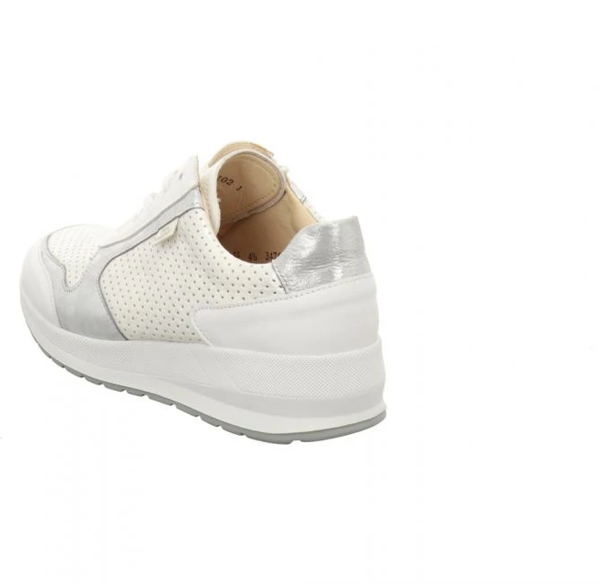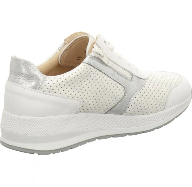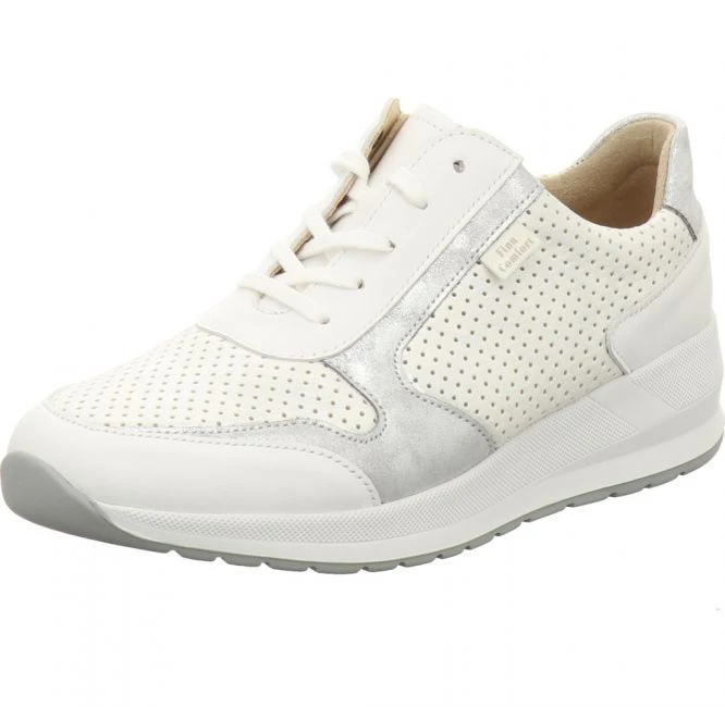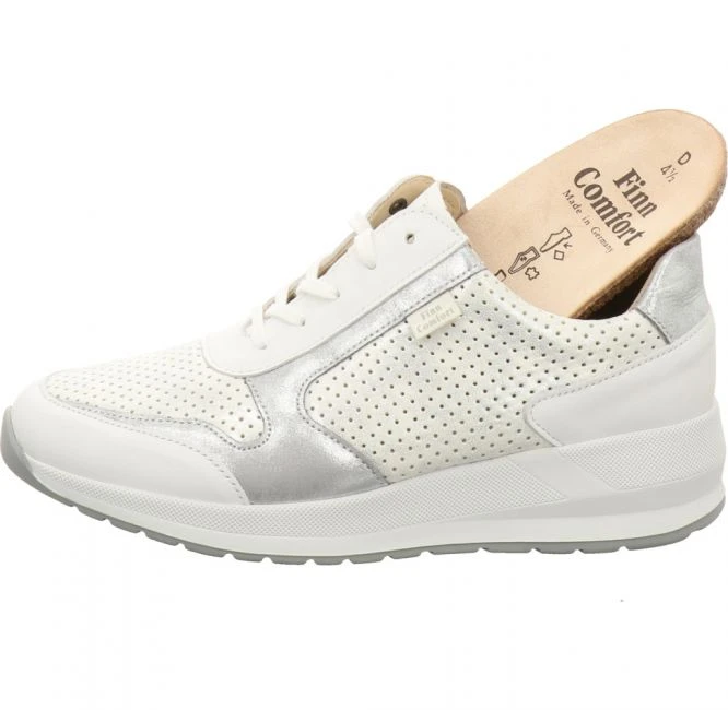 Modischer Schnürschuh aus dem Hause Finn Comfort. Er wurde aus glattem, metallisch schimmerndem Stretch Leder gefertigt. Modisches Highlight sind das perforierte Oberleder und die Einsätze in Kontrastfarbe. Das Innenfutter ist weich gepolstert und besteht ebenso aus Leder. Das mit Leder überzogene Korkfußbett ist austauschbar. Für Ihren persönlichen Gehkomfort können Sie Ihre eigenen orthopädischen Einlagen einsetzen. Der seitlich angebrachte Reißverschluss zusätzlich zur Schnürung bietet einen schnellen und bequemen Ein- und Ausstieg. Mit der markanten Laufsohle haben Sie jederzeit besten Halt. Ein wunderschöner und vielseitiger Sneaker für jeden Tag!