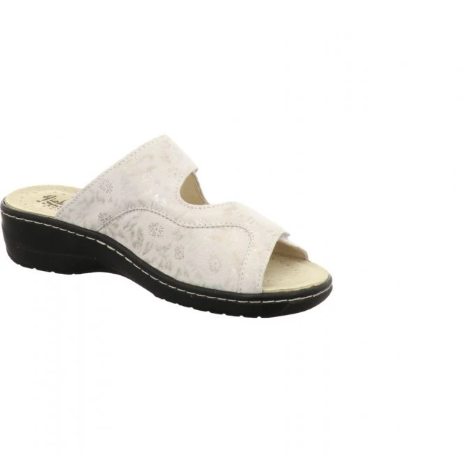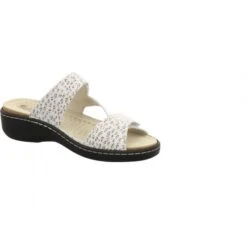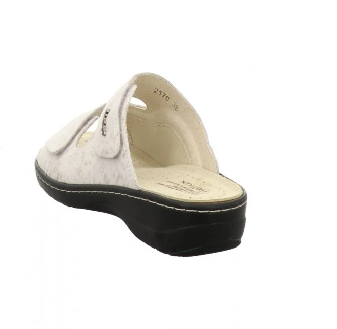 Tolle Damenpantolette des österreichischen Familienbetriebs Hickersberger in Weite G. Sie ist besonders komfortabel bei Hallux. Das Obermaterial besteht aus hochwertigem Leder. Ein besonderer Blickfang ist die leicht schimmernde Prägung und das Schmuckelement! Die beiden stufenlos verstellbaren Klettriemen passen sich Ihrem Fuß optimal an. Die leichte Sohle ist rutschhemmend. Das Korkfußbett mit duftenden Naturkräutern und atmungsaktivem Baumwollvlies ist mit hochwertigem perforiertem Leder überzogen. Für Ihren persönlichen Komfort können Sie das Fußbett gegen Ihre eigenen orthopädischen Einlagen tauschen. Ein gemütlicher und bequemer Schuh für jeden Tag!