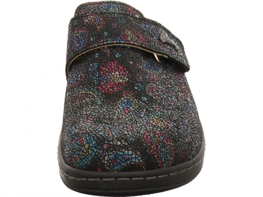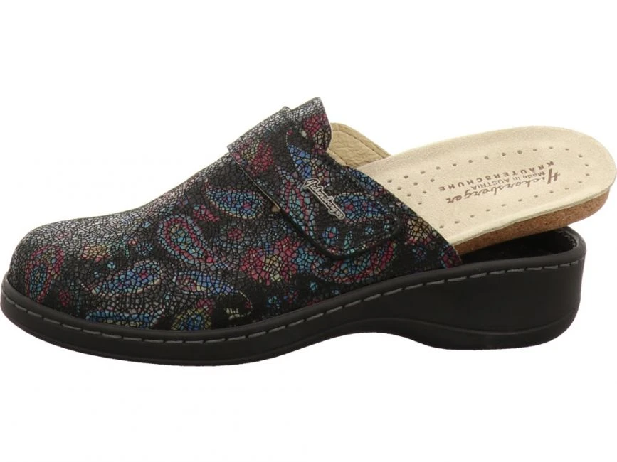 Bequemer Pantolette mit Klettverschluss von Hickersberger. Herausnehmbares Kräuterfußbett ist mit Leder bezogen.