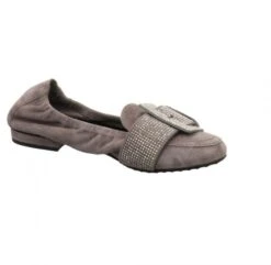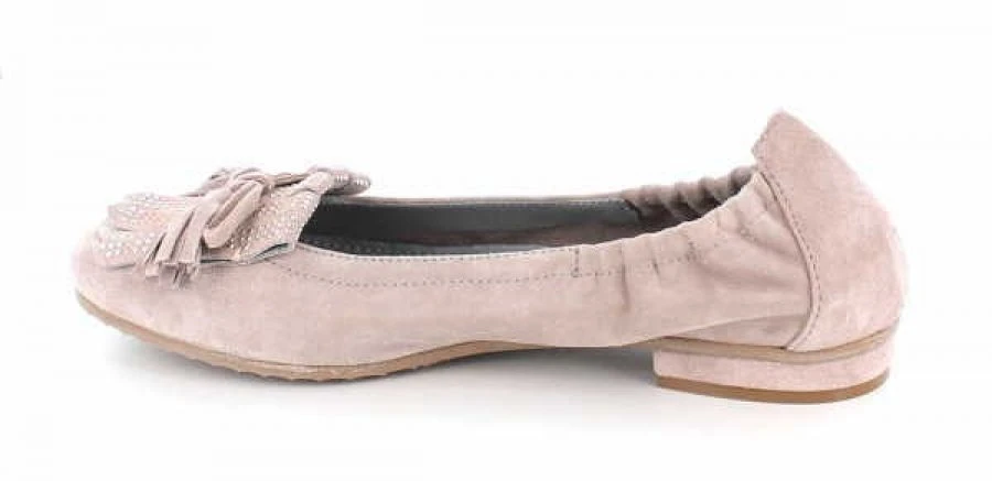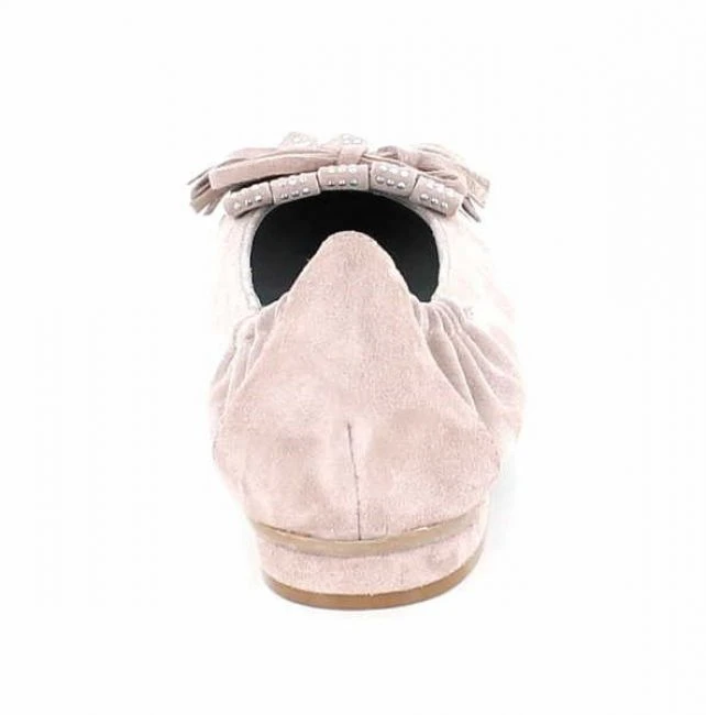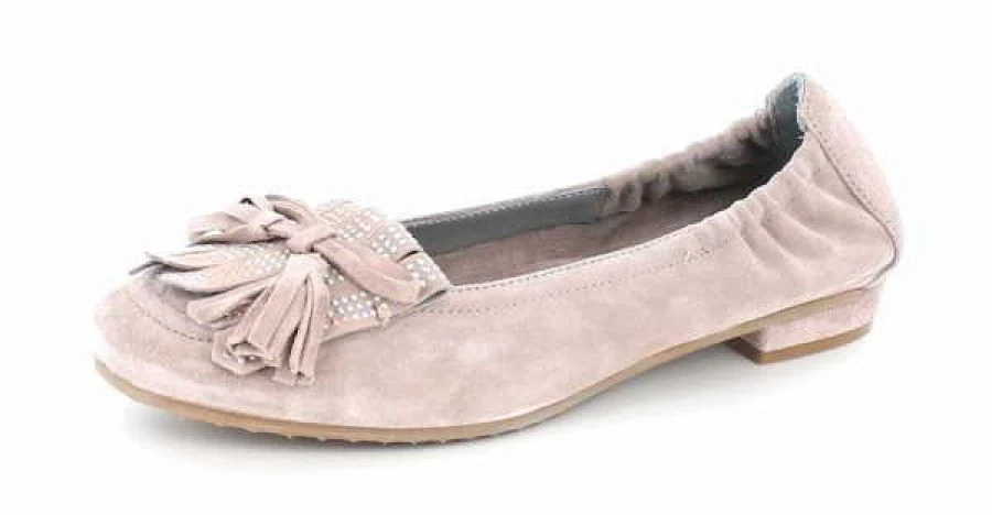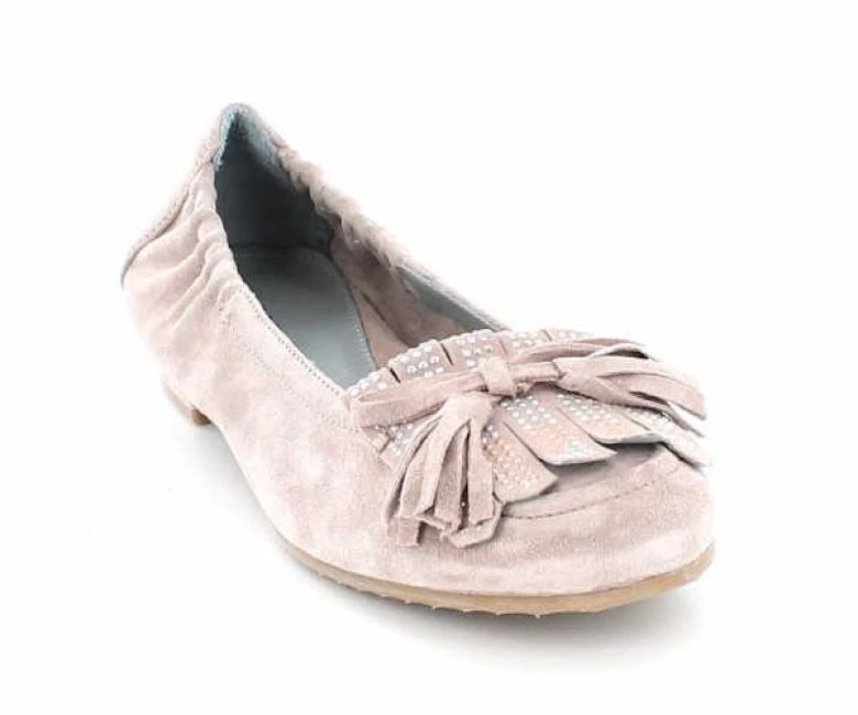 Eleganter Ballerina aus Velourleder in der Farbe rosé. Lederinnenfutter und Lederdecksohle. Moderne elegante Haferlasche mit Strass auf dem Vorderblatt.