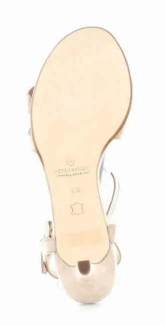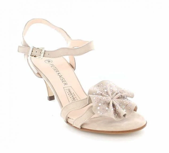 Edle Sandale in sand mit weichen Velourlederriemchen und einer Blume mit Swarovskisteinen. Lederdecksohle und Lederlaufsohle.