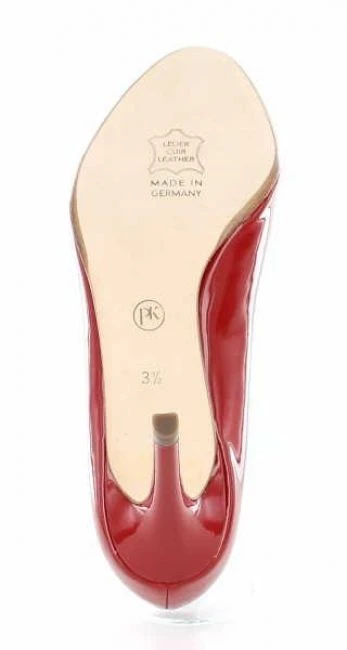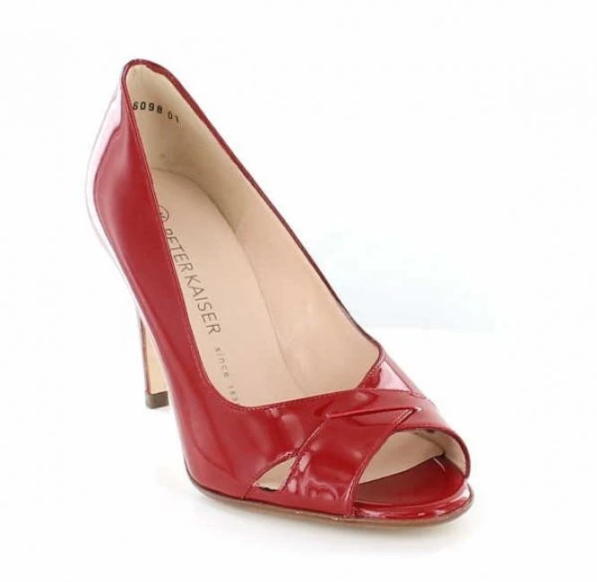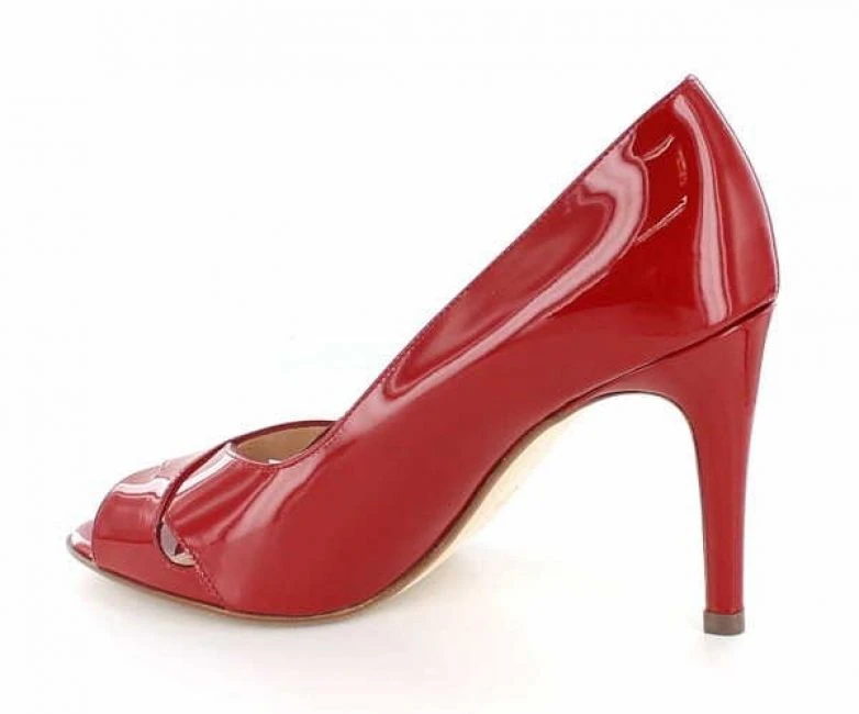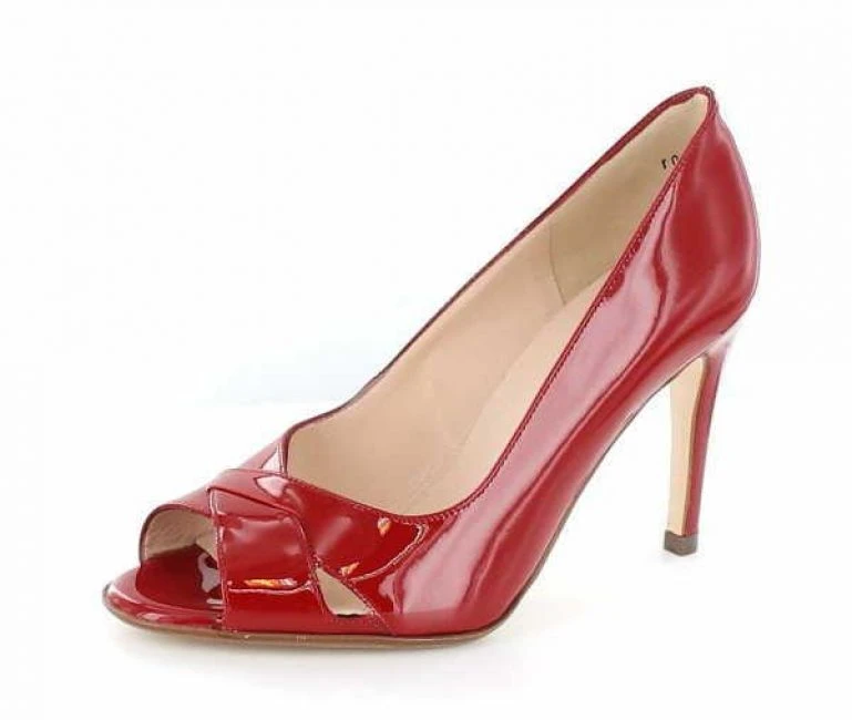 Eleganter Peeptoe aus rotem weichem Knautschlack in der Form Alda. Lederinnenfutter und Lederdecksohle. 85mm Absatzhöhe. Ein absoluter Hingucker!