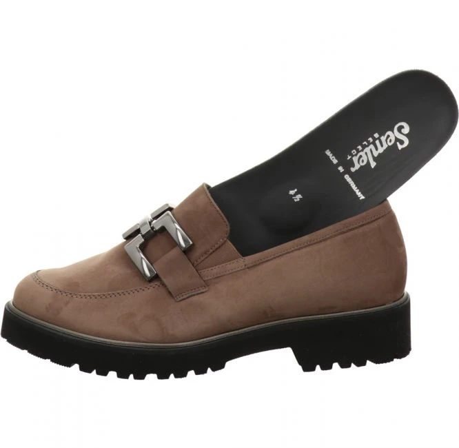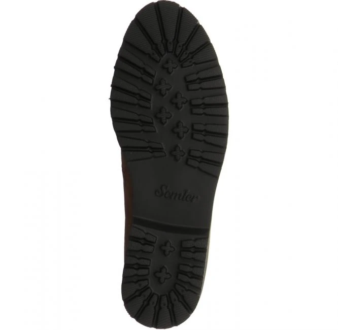 Modischer Slipper von Semler in Weite G plus. Das Obermaterial besteht aus Nubukleder. Für das Futter wurden Stretch-Textil und Leder verarbeitet. Das mit Leder überzogene Fußbett ist austauschbar. Für Ihren persönlichen Gehkomfort können Sie Ihre eigenen orthopädischen Einlagen einsetzen. Die beiden seitlich angebrachten Elastikeinsätze sorgen für einen einfachen Ein- und Ausstieg und beste Anpassung an Ihren Fuß. Mit der leichten Micogummisohle haben Sie jederzeit besten Halt. Die Absatzhöhe beträgt ca. 3,5 cm. Ein besonderer Hingucker ist die Kettenapplikation auf dem Vorfuß und die Laufsohle in Kontrastfarbe. Ein femininer und bequemer Schuh der vielseitig kombinierbar ist.