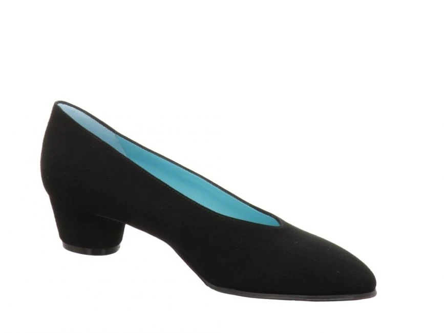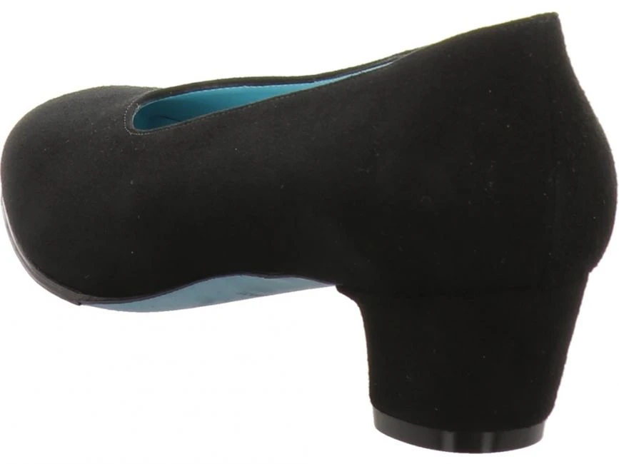 Schwarze Pumps von Thierry Rabotin aus weichem Veloursleder. Innen ist der Schuh mit Leder ausgekleidet. Die Ledersohle hat eine Gummiprofilauflage. Die Pumps verfügen über einen geschwungenen Absatz, mit einer Absatzhöhe von ca. 35 mm.