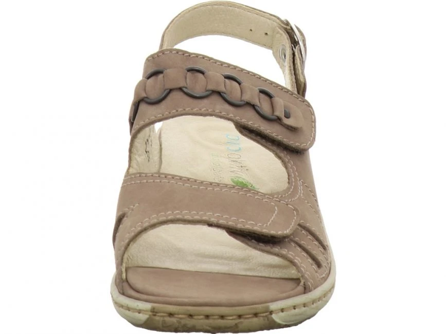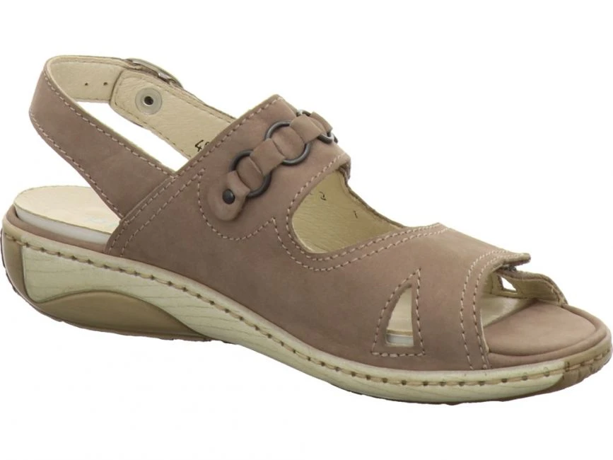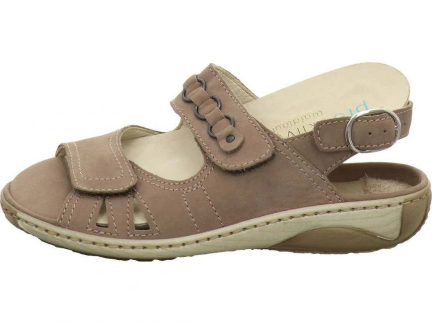 Modische Sandale von Waldläufer in Weite G mit schmaler Ferse. Obermaterial und Futter bestehen aus hochwertigem Leder. Das mit Leder überzogene Fußbett ist austauschbar. Für Ihren persönlichen Gehkomfort können Sie Ihre eigenen orthopädischen Einlagen einsetzen. Dank der beiden stufenlos verstellbaren Klettriemen und dem Fersenriemen mit Dornschließe passt sich diese elegante Sandale perfekt an Ihren Fuß an. Die Ziernähte und das modische Zierelement machen dieses Modell zum Hingucker! Eine vielseitig kombinierbare und luftig leichte Sandale für warme Sommertage!