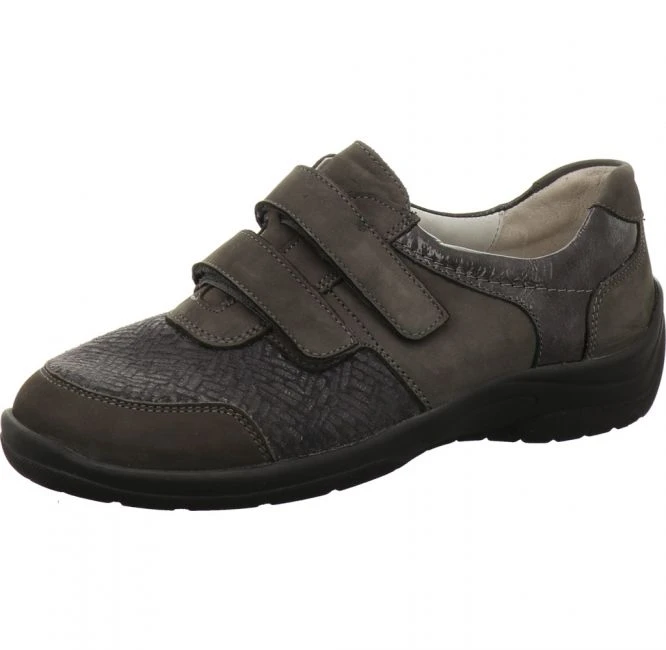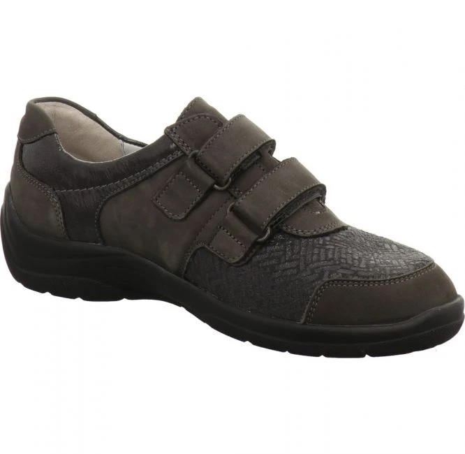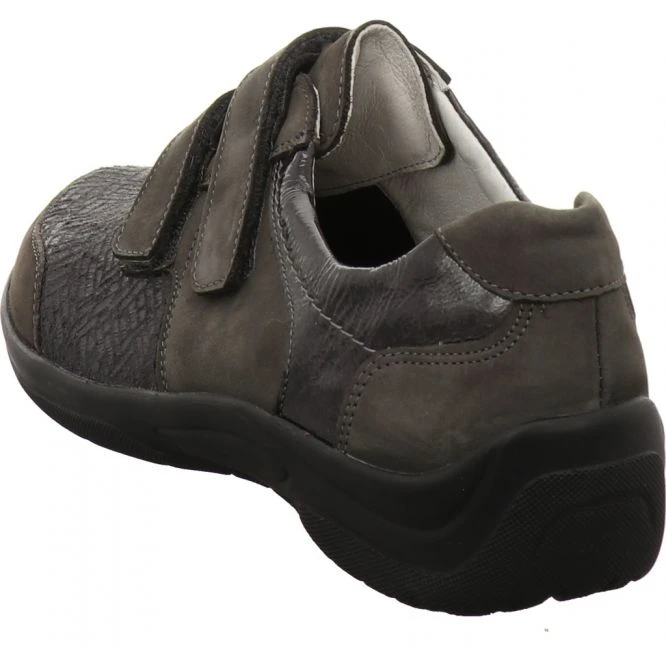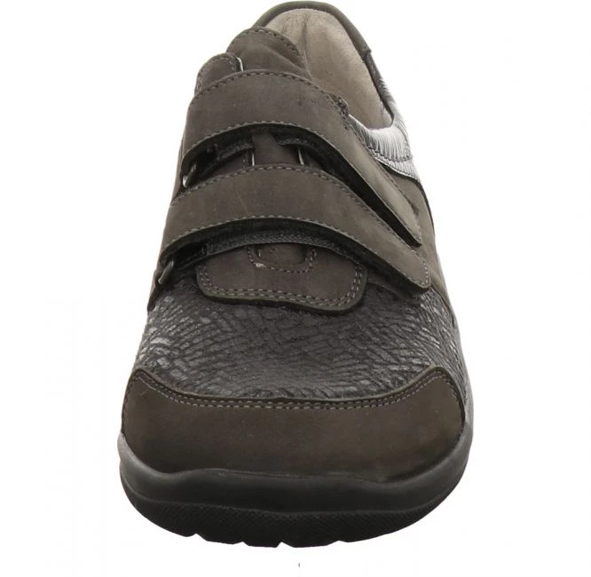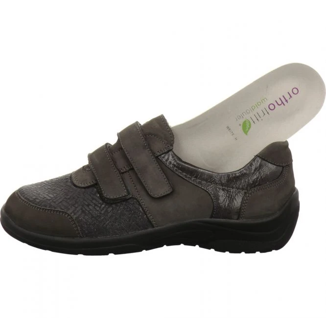 Leichter Schuh von Waldläufer in Weite H. Das Obermaterial besteht aus einem Mix aus Nubukleder, Lackleder und modisch geprägtem Stretch Textil. Das Futter aus Leder und Textil sorgt für ein angenehmes Fußklima. Das Orthotritt Fußbett ist austauschbar. Für Ihren persönlichen Gehkomfort können Sie Ihre eigenen Einlagen einsetzen. Der beiden stufenlos verstellbaren Klettverschlüsse bieten einen bequemen Ein- und Ausstieg und beste Anpassung. Die leichte PU-Laufsohle sorgt jederzeit für besten Halt. Ein vielseitig kombinierbarer Begleiter für jeden Tag!