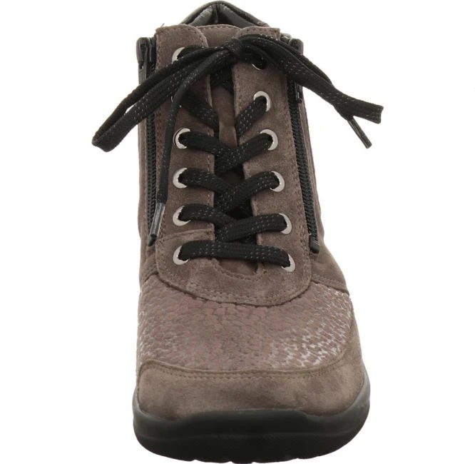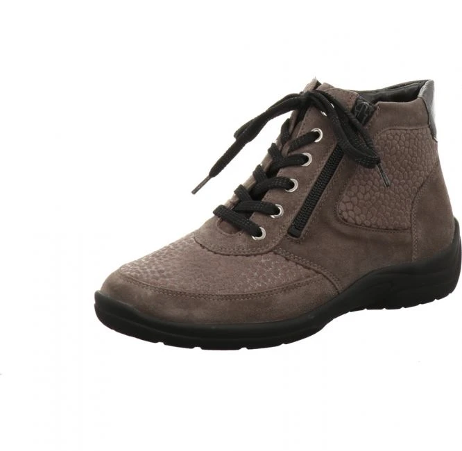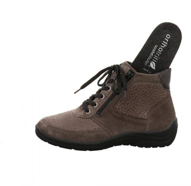 Modischer Schnürschuh von Waldläufer in Weite H. Das Obermaterial besteht aus schimmernd geprägtem Veloursleder. Das textile Warmfutter sorgt für ein angenehmes Fußklima. Auf dem Vorfuß wurde anschmiegsames Stretchtextil eingearbeitet. Orthotritt bietet höchsten Tragekomfort für sensible Füße. Der Einsatz aus Lackleder rundet die modische Optik ab. Die mit Filz überzogene Innensohle ist austauschbar. Für Ihren persönlichen Gehkomfort können Sie Ihre eigenen orthopädischen Einlagen einsetzen. Für einen bequemen Ein- und Ausstieg sorgen die beiden seitlich angebrachten Reißverschlüsse zusätzlich zur Schnürung. Die leichte Laufsohle sorgt jederzeit für besten Halt. Ein bequemer Begleiter der sich vielseitig kombinieren lässt!